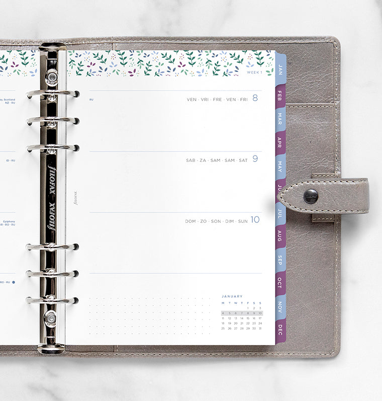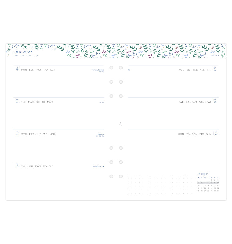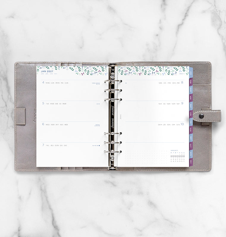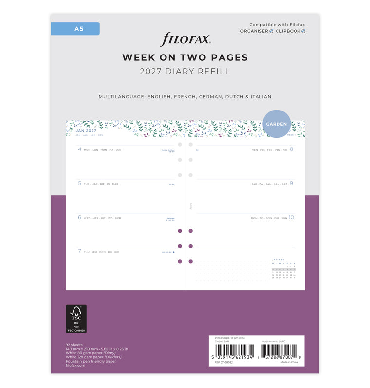 Plan ahead in our diary refill from the Garden Collection. This blooming floral A5 refill offers a horizontal week to view layout with beautiful design accents for inspiring creativity and joy. Features a “Belongs to" page designed for adding a personal touch. Calendars of the current and next years are included to give you the chance to plan ahead, while the friendly dashboard pages invite the beginning of a new month. Discover the “Big Plans" section with dotted pages for monthly goals. At the end of the diary, you can also find dotted and ruled pages, perfect for your notes and doodles.