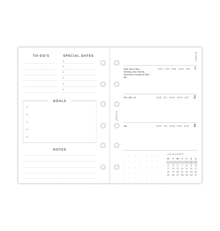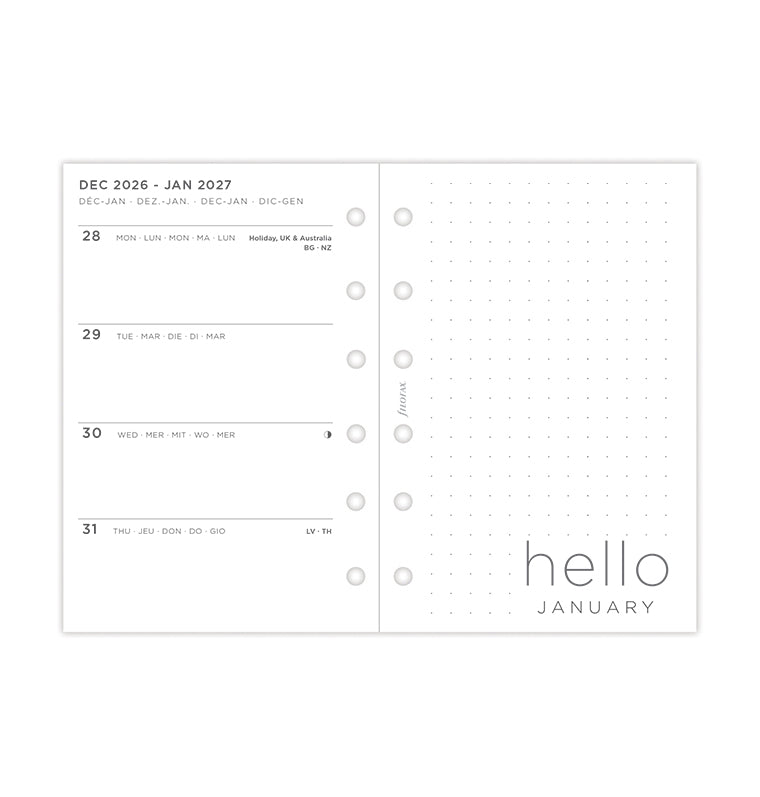 Add a personal touch to your plans with our Minimal Dated Refill. This contemporary Pocket refill offers a horizontal week to view layout and clean crisp white pages for endless organisation. Features a “Belongs to" page designed for adding a personal touch. Calendars of the current and next years are included to give you the chance to plan ahead, while the friendly dashboard pages invite the beginning of a new month. Discover the “Big Plans" section with dotted pages for monthly goals. At the end of the diary, you can also find dotted and ruled pages, perfect for your notes and doodles.