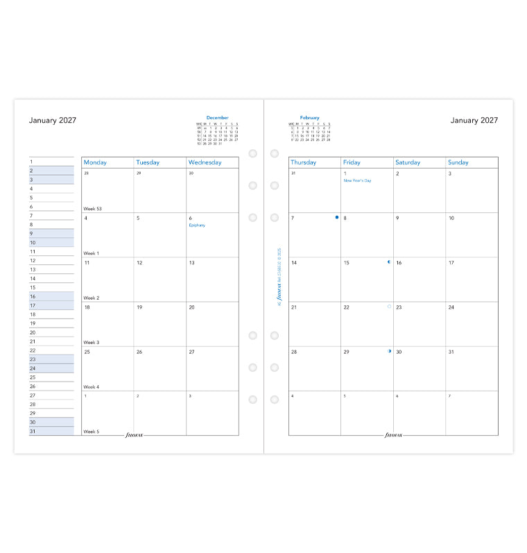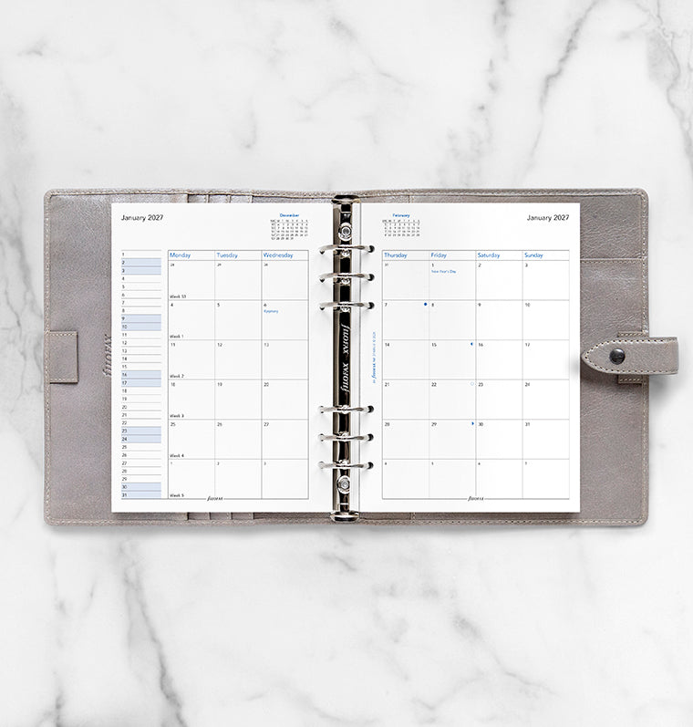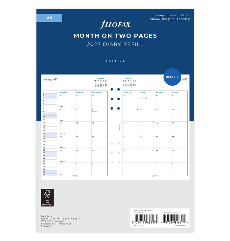 Organise your life a month at a time with this A5 month on two pages diary refill. English language only.