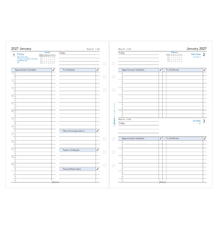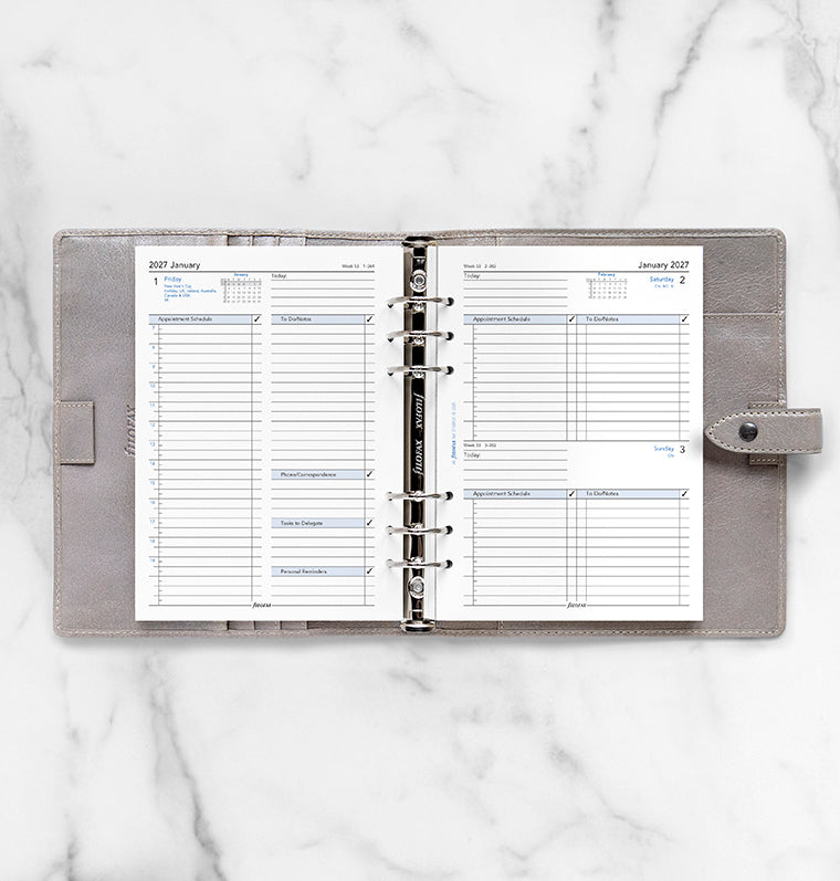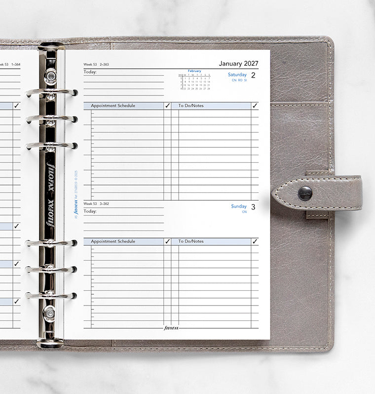 Organise your appointments with this A5 day per page diary with additional business pages. Saturday and Sunday are combined on one page.