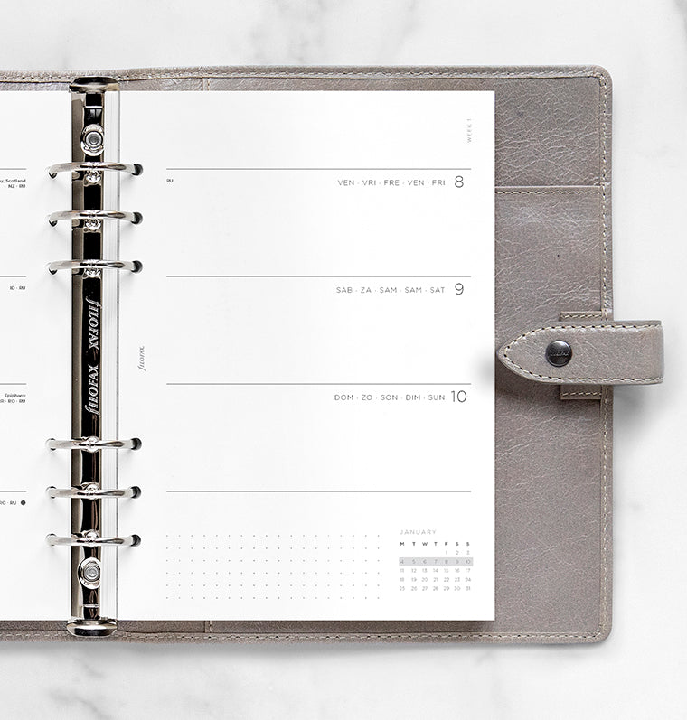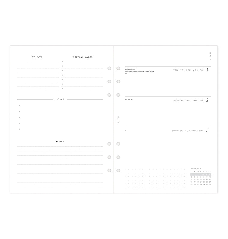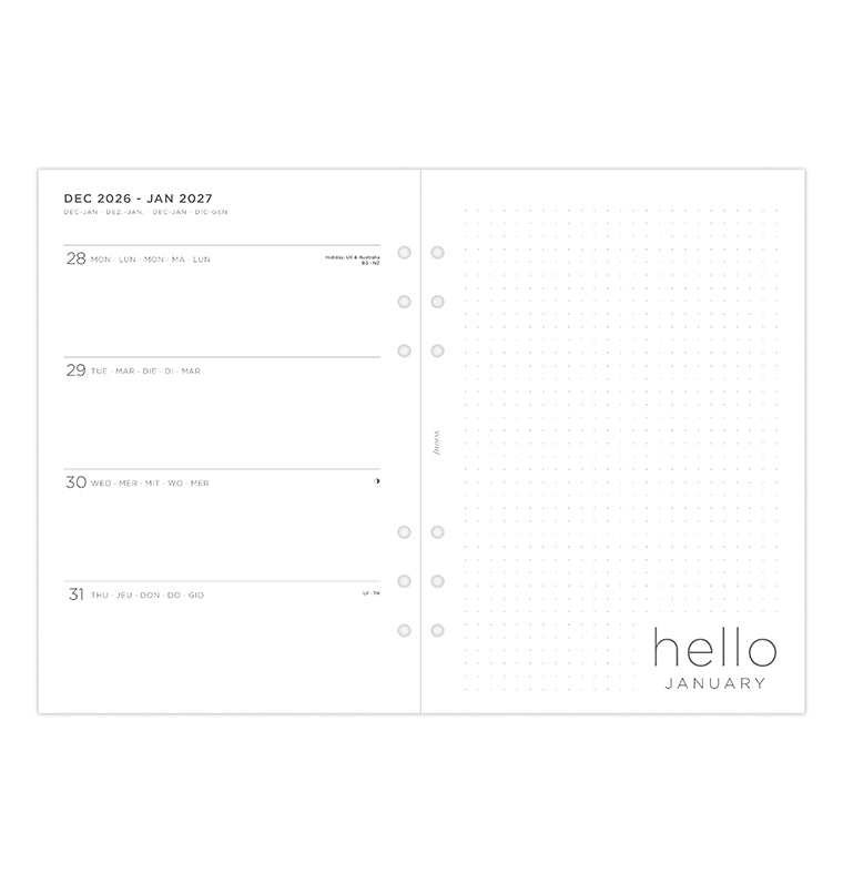 Add a personal touch to your plans with our Minimal Dated Refill. This contemporary A5 refill offers a horizontal week to view layout and clean crisp white pages for endless organisation. Features a “Belongs to" page designed for adding a personal touch. Calendars of the current and next years are included to give you the chance to plan ahead, while the friendly dashboard pages invite the beginning of a new month. Discover the “Big Plans" section with dotted pages for monthly goals. At the end of the diary, you can also find dotted and ruled pages, perfect for your notes and doodles.