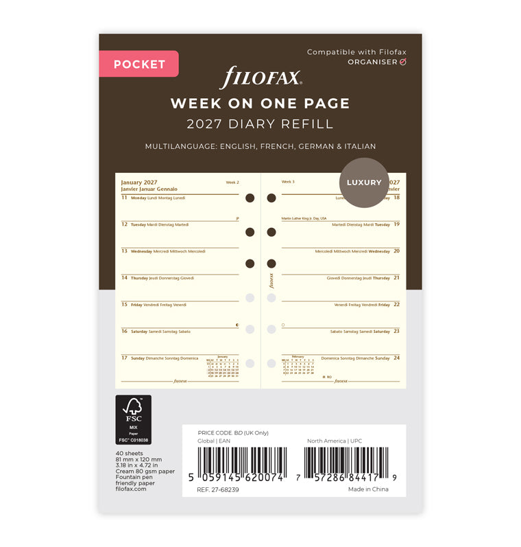 Organise your week in detail with this pocket week on one page diary, in four languages. Features luxury cotton cream paper.