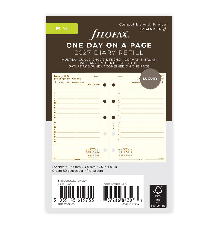 Organise your day in detail with this day per page diary in four languages on luxury cotton cream paper. Saturday and Sunday are combined on one page.