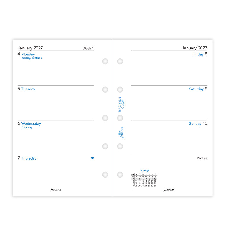 Organise your week at a glance with this mini week on two pages diary, English language only.