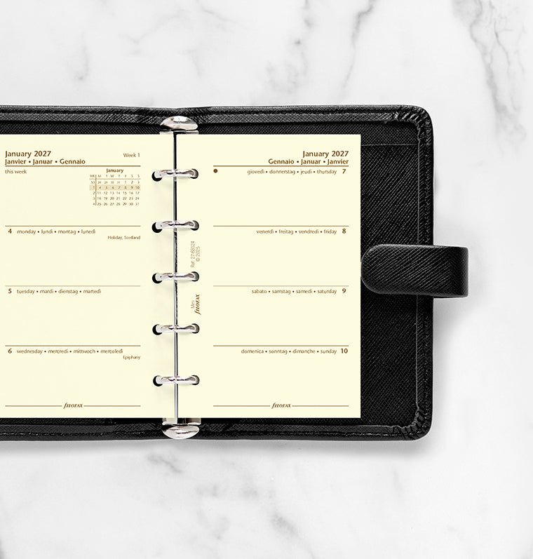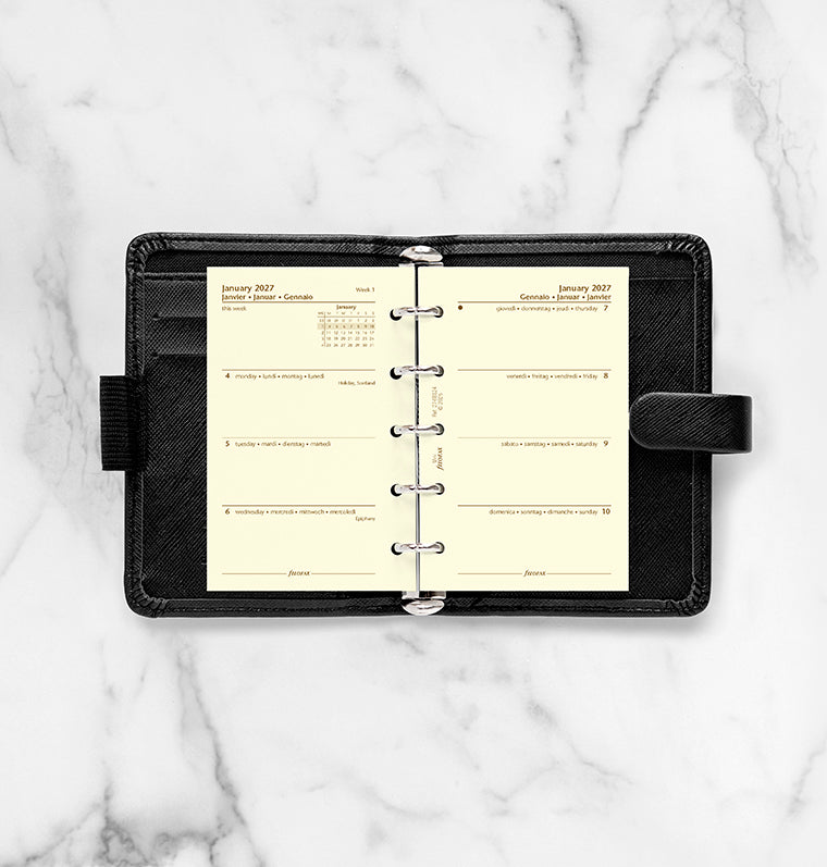 Organise your week at a glance with this mini week on two pages diary on luxury cotton cream paper, in four languages.