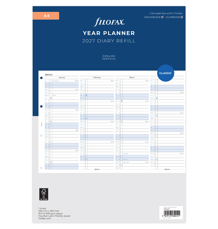 Plan your whole year with this A4 vertical format fold out year planner. English language only.